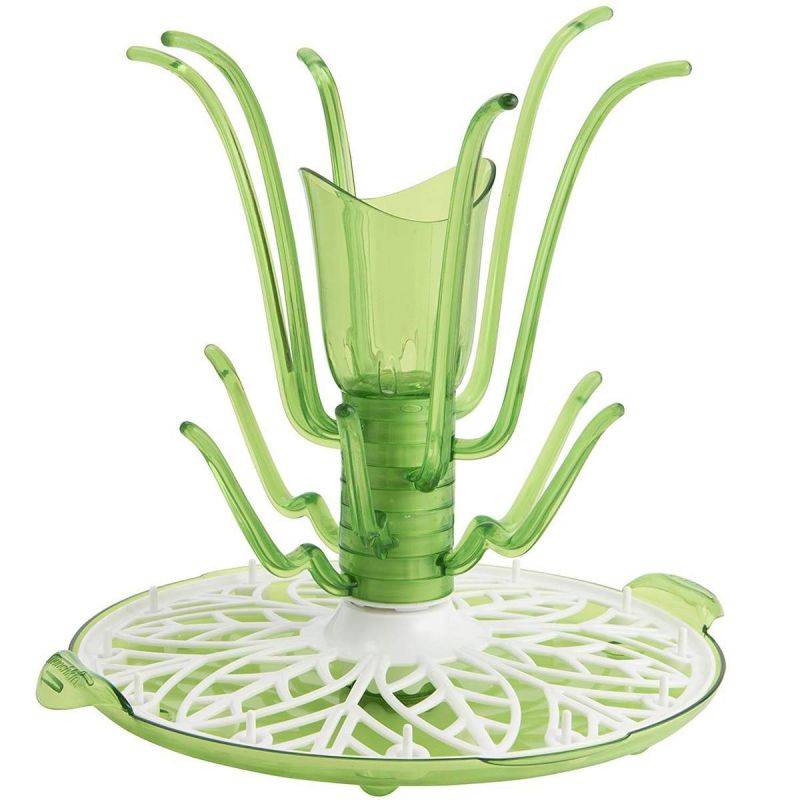 מעמד לייבוש בקבוקים מעוצב ואופנתי בהשראת הטבע, המסתובב 360 מעלות, בעל מאגר ניקוז הנועד להשאיר את משטח ההנחה יבש.