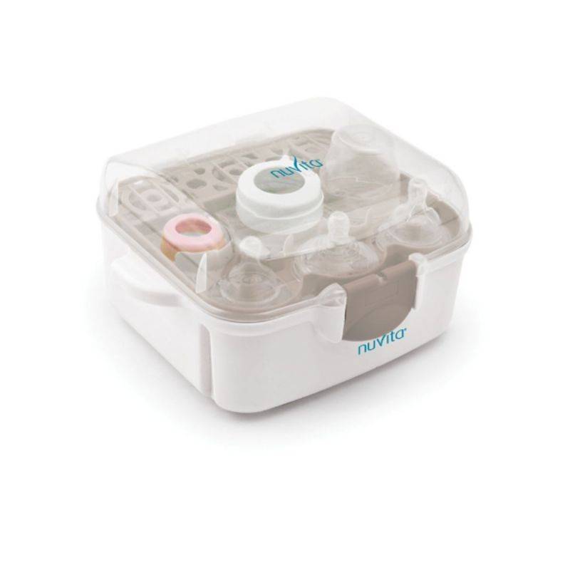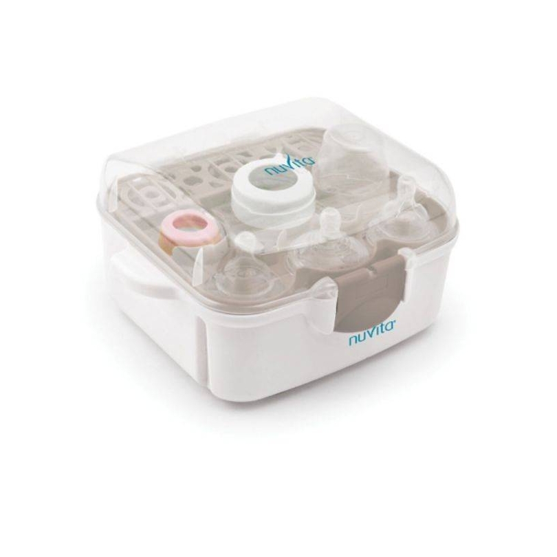 סטריליזטור למיקרוגל מבית nuvita איטליה.מידותיו הקומפקטיות מאפשרות להכניסו לכל מכשיר מיקרוגל. מעקר חיידקים בפעולת אידוי. מתאים ל-3 בקבוקים + חלקים קטנים ומוצצים. ידיות חיצוניות המונעות כוויה . ניתן להשאיר את המכשיר נעול למשך 24 שעות.