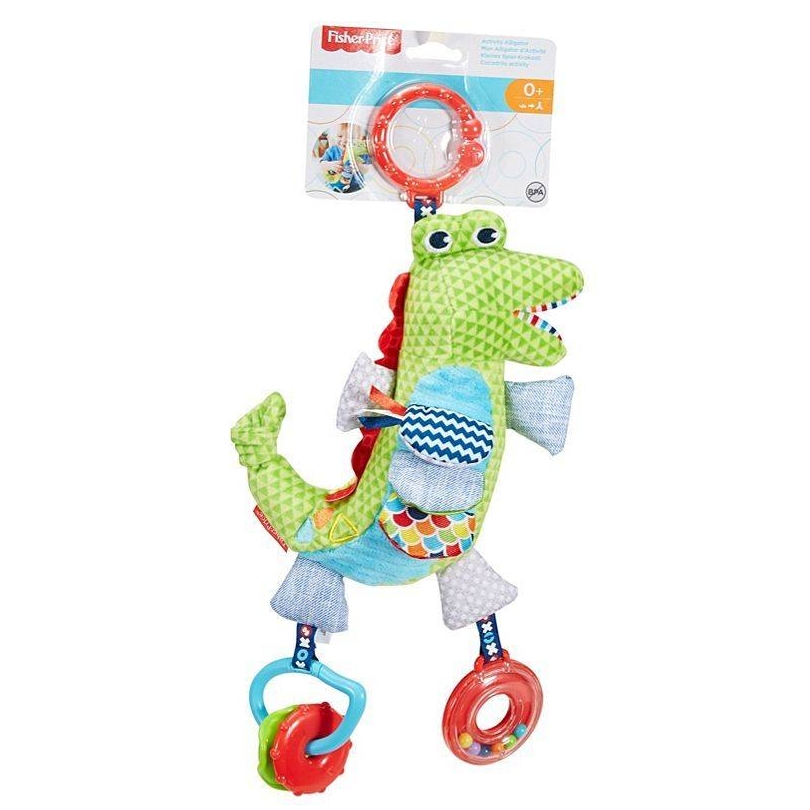 מגיל 0+בובת תנין נתלת, רכה בצבעים בהירים ועדינים עם אלמנטים גמישים המרגישים כמו קמטים. בנוסף, על רגלי הבובה תלויים שני צעצועים מתנדנדים