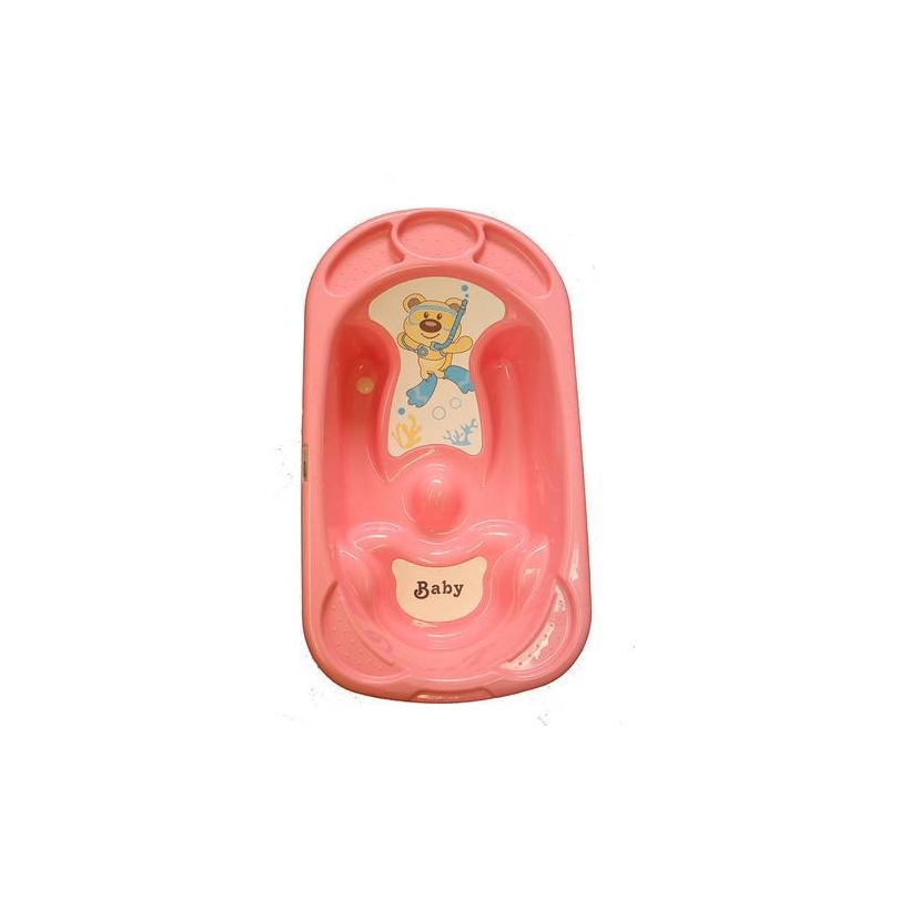 אמבטיה לתינוק בעיצוב מתוק של דובי צולל, המתאימה למבנה גופו של התינוק. אמבטיה מרווחת עם משטח להנחת כלי רחצה וסבון
