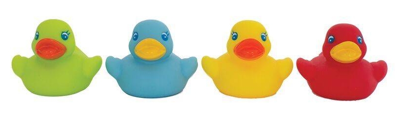 הברווזונים צפים על פני המים ומצפצפים כאשר התינוק לוחץ אותם בין ידיו.