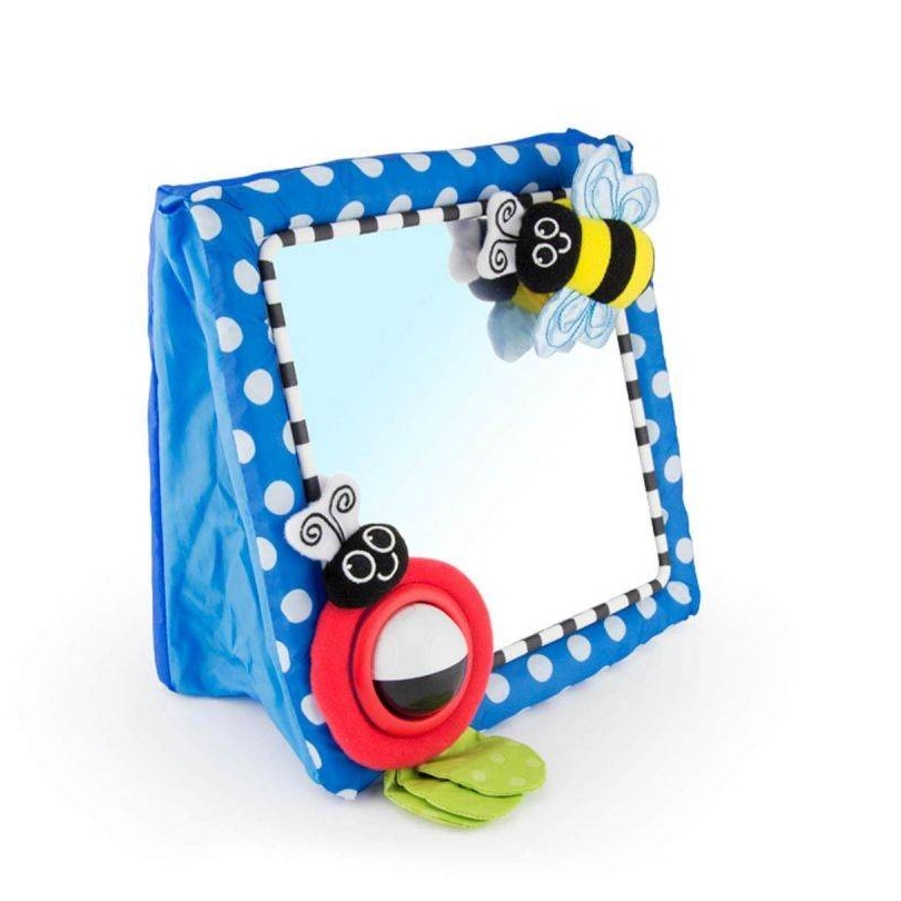 • השתקפות אמיתית במראה אשר מפתחת את כישורי הראייה. • לתינוקות יש העדפה ברורה לפנים אנושיות.• עלים במגוון מרקמים מאפשרים משחק גלוי-נסתר.• ניגודי צבעים ותבנית בולטים של החיפושית והכדור מפתחים כישורי ראייה, גם עבור תינוקות בגיל לידה.• דבורה סימטרית, רוטטת ומקליקה, מעודדת מגע ומישוש ומחזקת את הראייה.• מעמד (כן) תומך במראה על משטח ורצועות אלסטיות מאפשרות חיבור קל למיטה.• רעיונות לאינטראקציה הורה-ילד• תלה את המראה על משטח התינוק על מנת לעודד אותו להגיע אליה.• הצבע על השתקפותו ותאר לו מה אתה רואה.• כאשר התינוקות גדלים וגופם מתחזק, מקם את המראה על הרצפה (או כל משטח אחר) למשחק במנח שכיבה על הבטן ועזור לתינוק לחזק את הקואורדינציה בין ידיו.